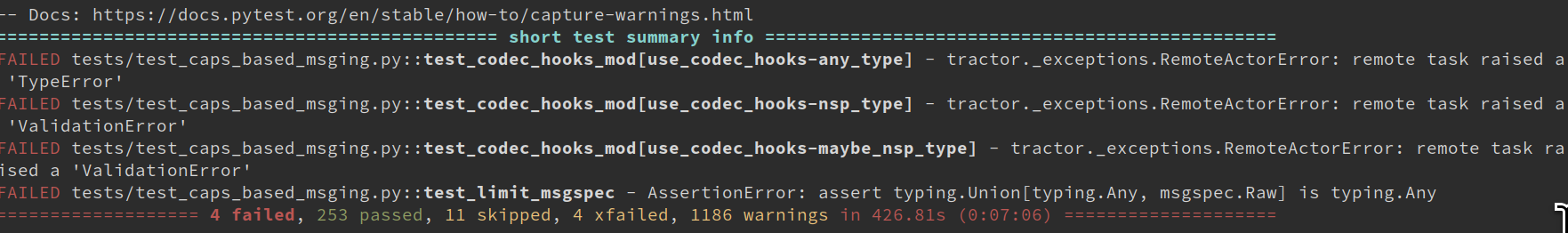 tractor.msgrelated underbelly,e57ac63f56Avoid attr-err whenMsgTypeError._ipc_msg==Noneon sender side.fde6d84Fix msg-draining onparent_never_opened_stream!b0ab77aSlightPldRxrework to simplify, like01b5955AddContext._outcome_msguse newPldRxAPI51f7280AddMsgStream._stop_msguse newPldRxAPI4d9f6e73Supportctx: UnionTypeannots for@tractor.contextepsef7a585Deliver aMaybeBoxedErrorfrom.expect_ctxc()Testing related fixes & improvements,